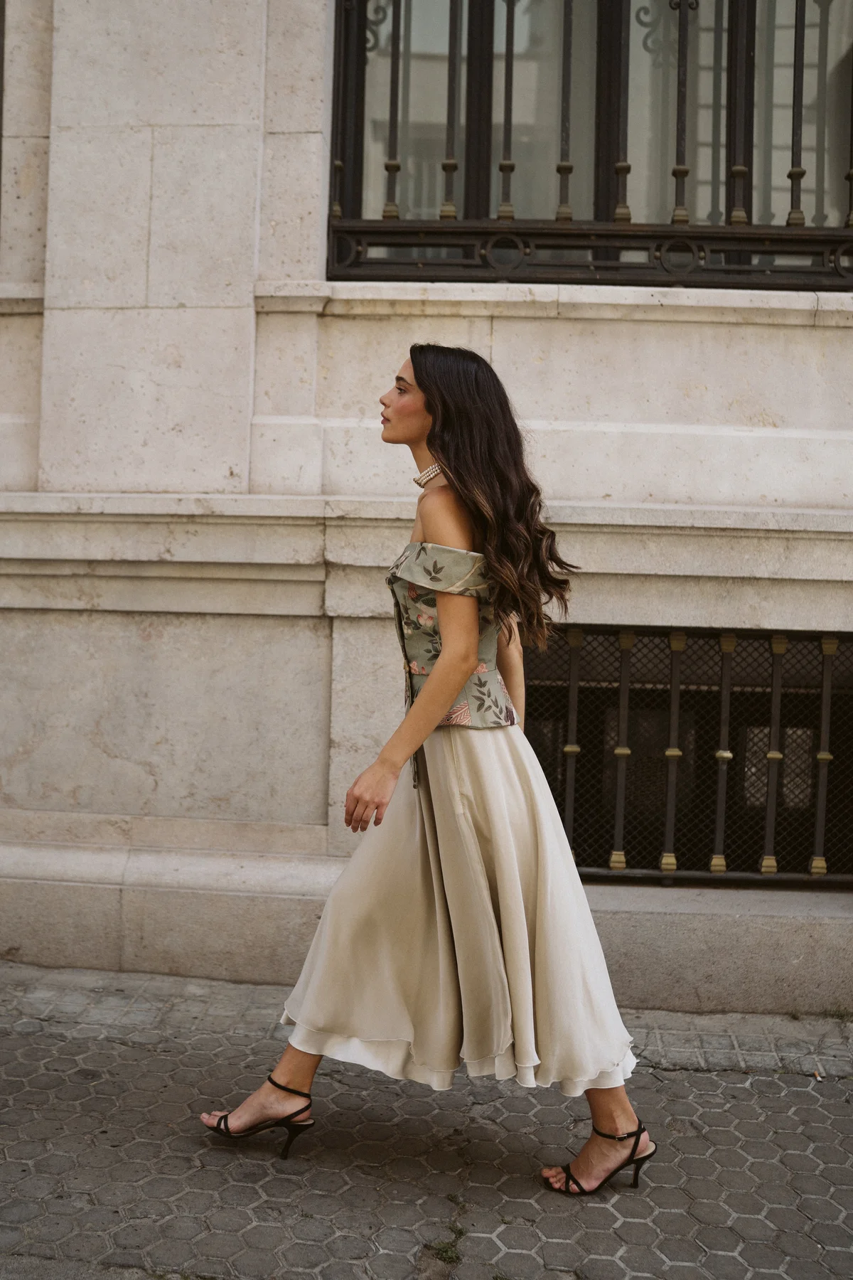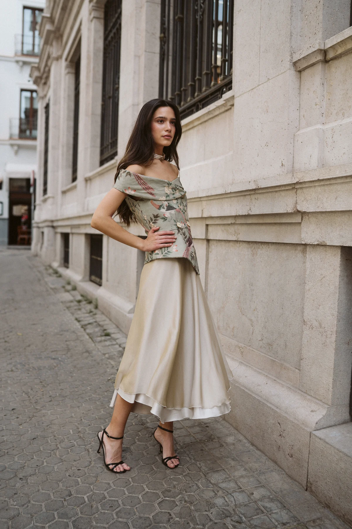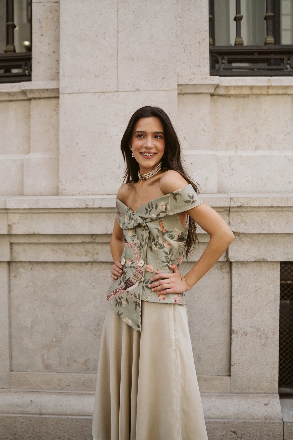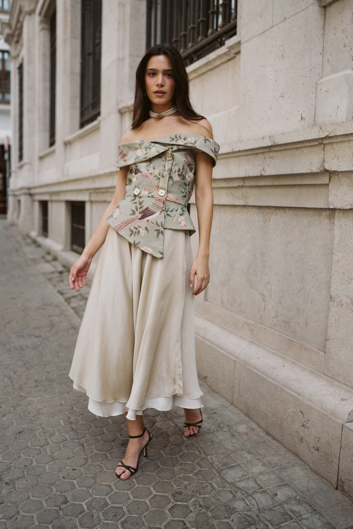 La Blusa Chaqueta Gala es un clásico de nuestra marca. Destaca por su patrón asimétrico y su escote con hombros descubiertos, que enmarca la figura. Su botonadura frontal aporta estructura, mientras que el bajo en pico estiliza visualmente la silueta. En esta ocasión elaborada en un tejido print.