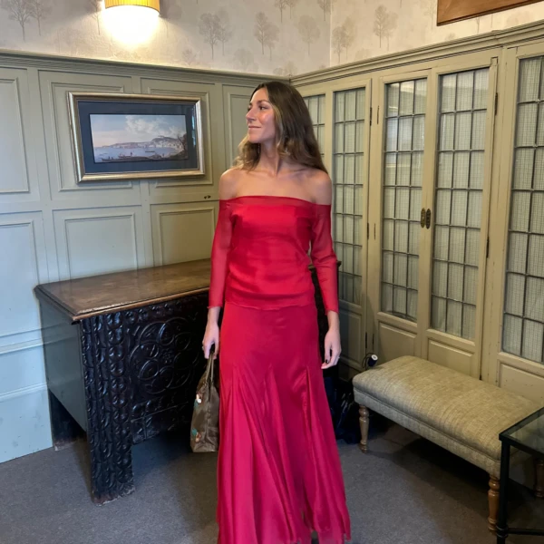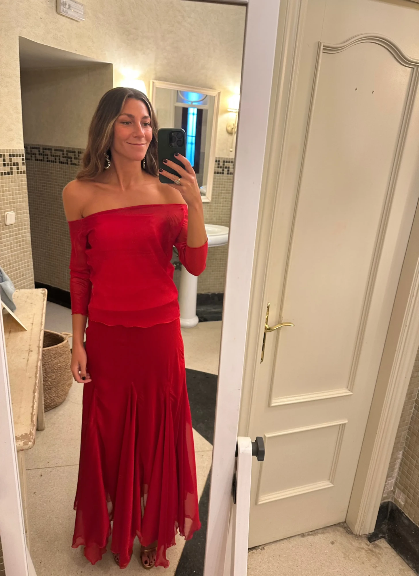 El conjunto Emily reúne top de escote bardot y falda midi de gasa para crear un look de invitada ligero y muy favorecedor. El top se confecciona en gasa al bies con forro, se adapta al cuerpo sin marcar y deja los hombros al descubierto, resaltando cuello y clavícula. La falda, también en gasa, tiene corte de godets que aporta un vuelo sutil y una silueta fluida al caminar. Su tiro alto con cinturilla y cremallera invisible lateral estiliza la figura y equilibra el conjunto.