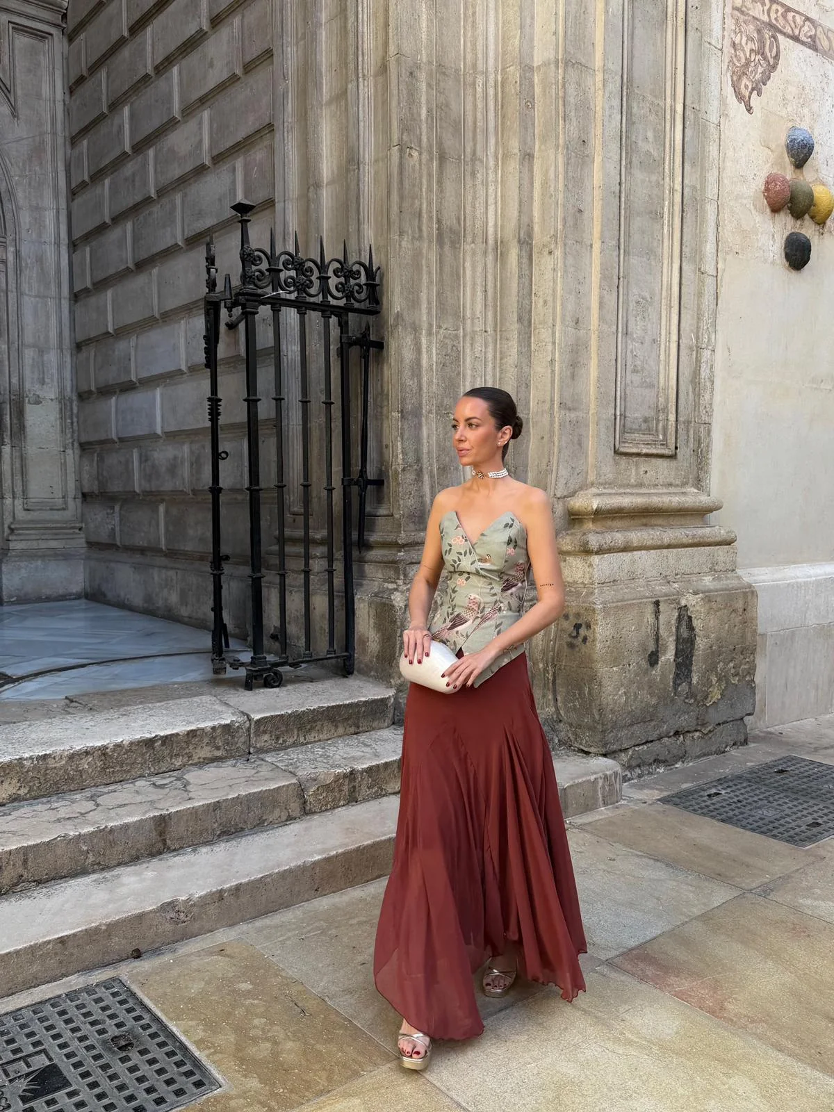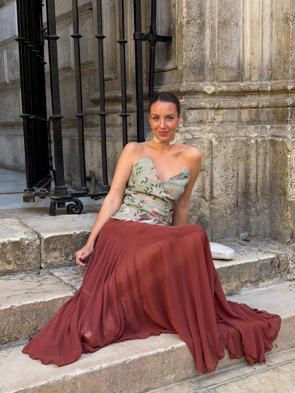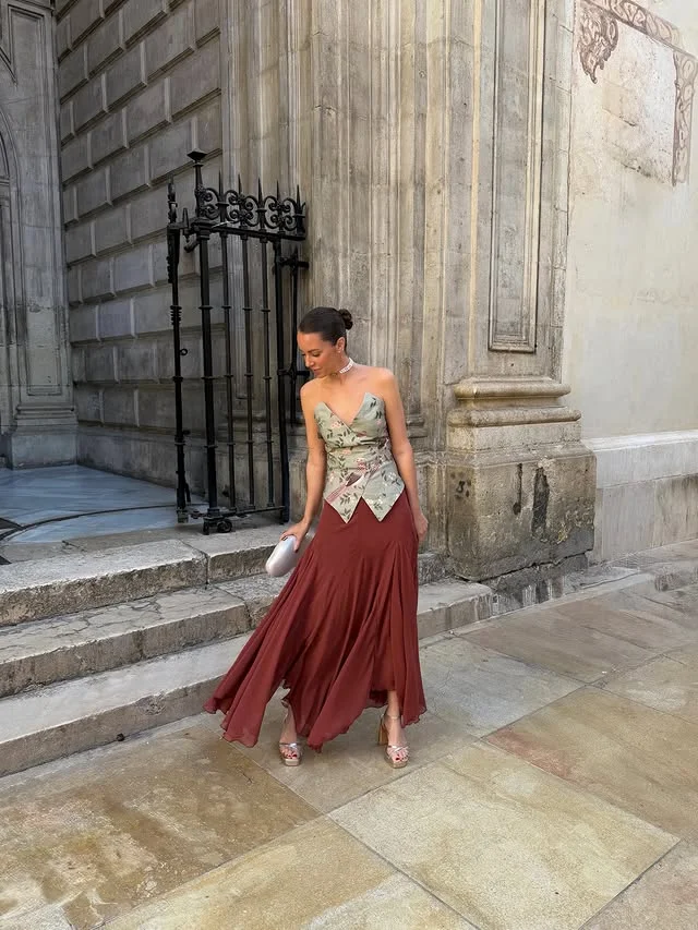 La falda Emily es una falda midi confeccionada en gasa con corte de godets, que aporta un vuelo sutil y dibuja una silueta fluida al caminar. Lleva forro en punto de seda para ganar comodidad y caída, y se ciñe en la cintura con cinturilla y cremallera invisible.