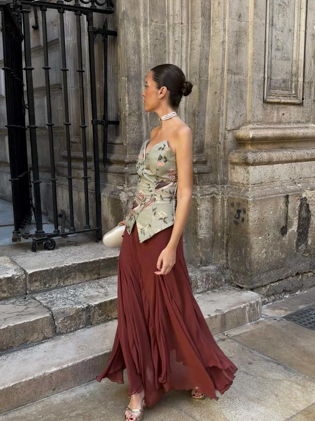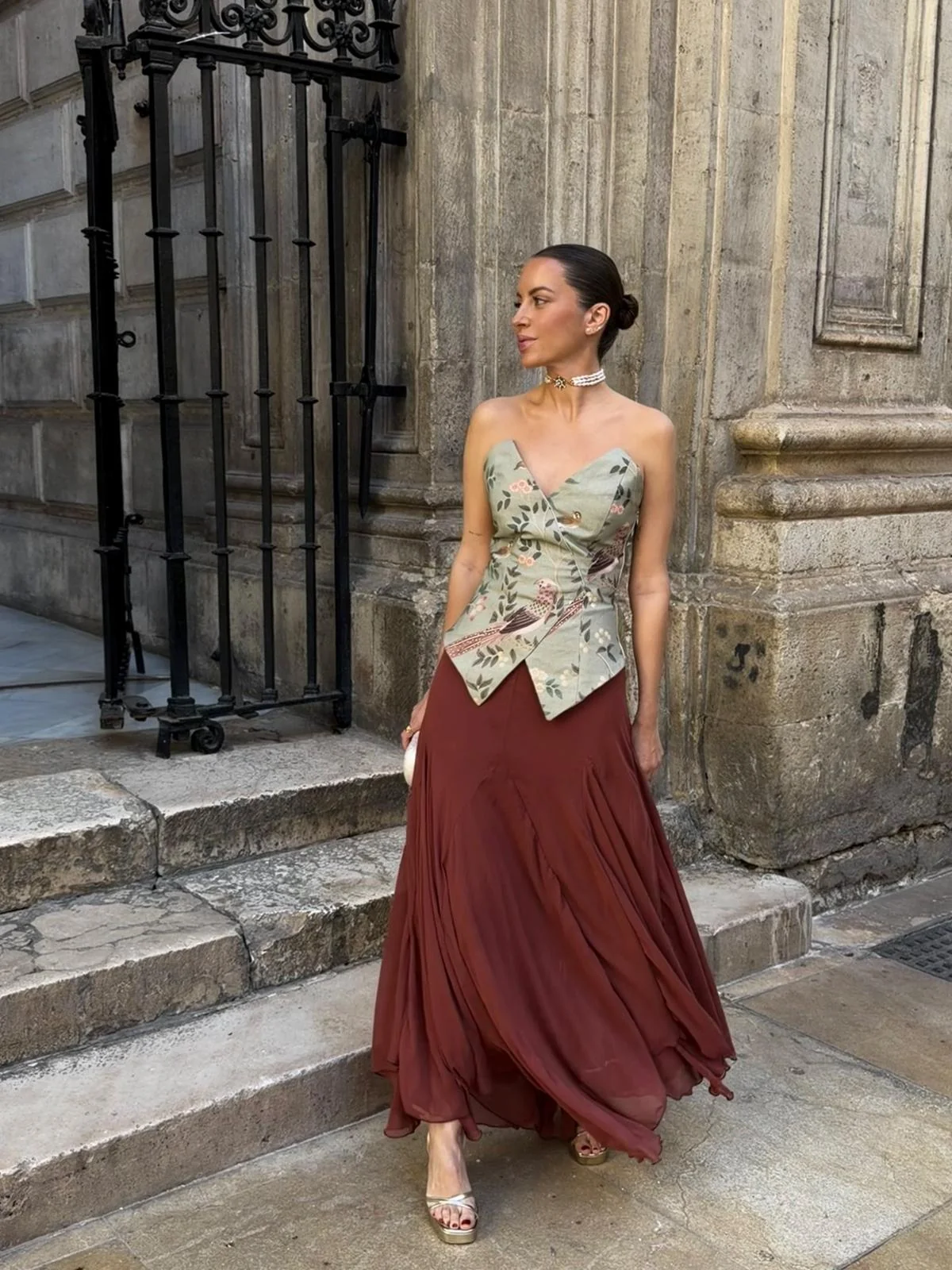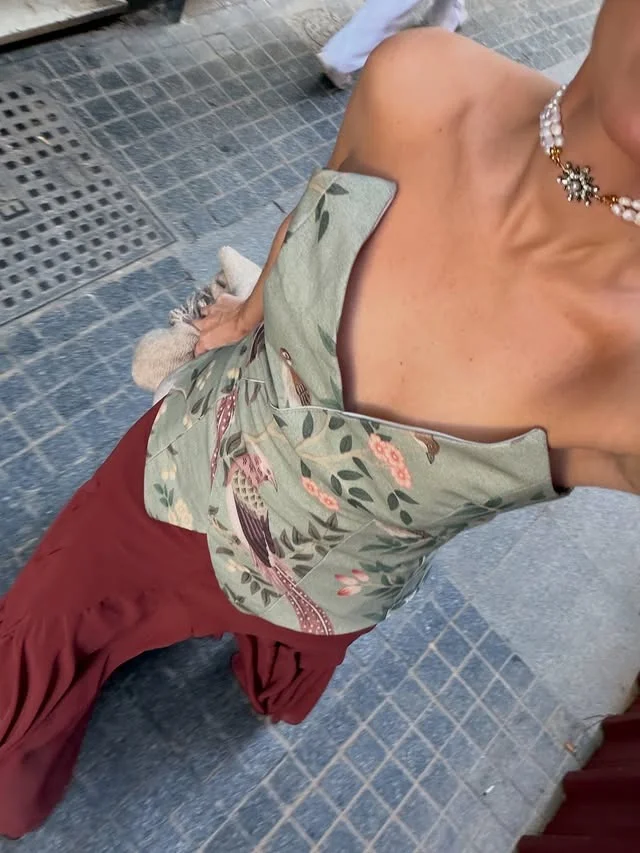 Su estructura tipo bustier con escote en V pronunciado moldea y realza la figura de forma espectacular. El acabado asimétrico en la cintura no solo es tendencia, sino que ayuda a alargar visualmente el torso y combina a la perfección con prendas de tiro alto. El estampado botánico muestra una gran riqueza de detalle.