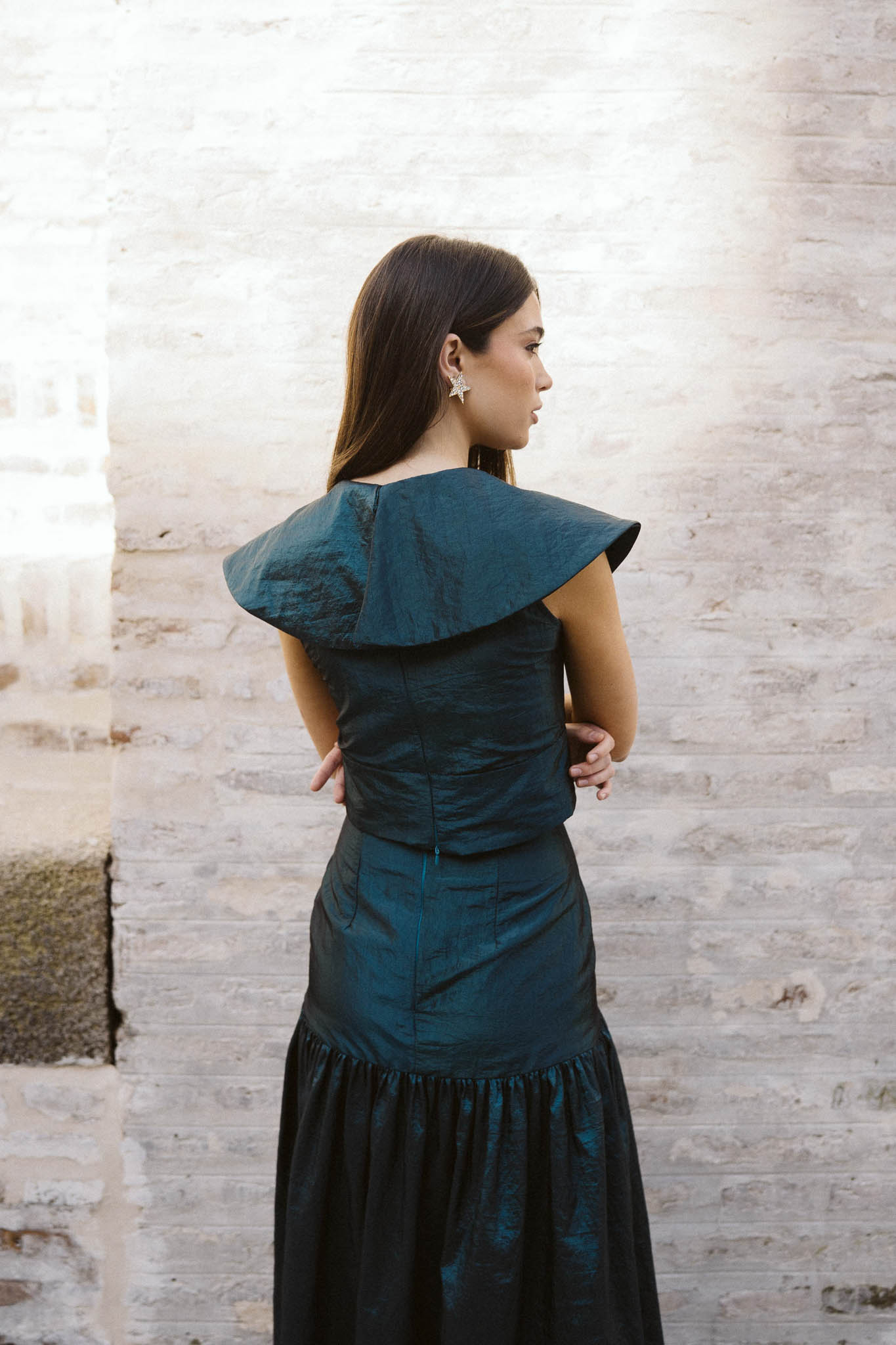 Falda confeccionada en suave tejido de tafetán, corte a la cadera. Cremallera trasera. La confección de las fotos es azul petróleo.