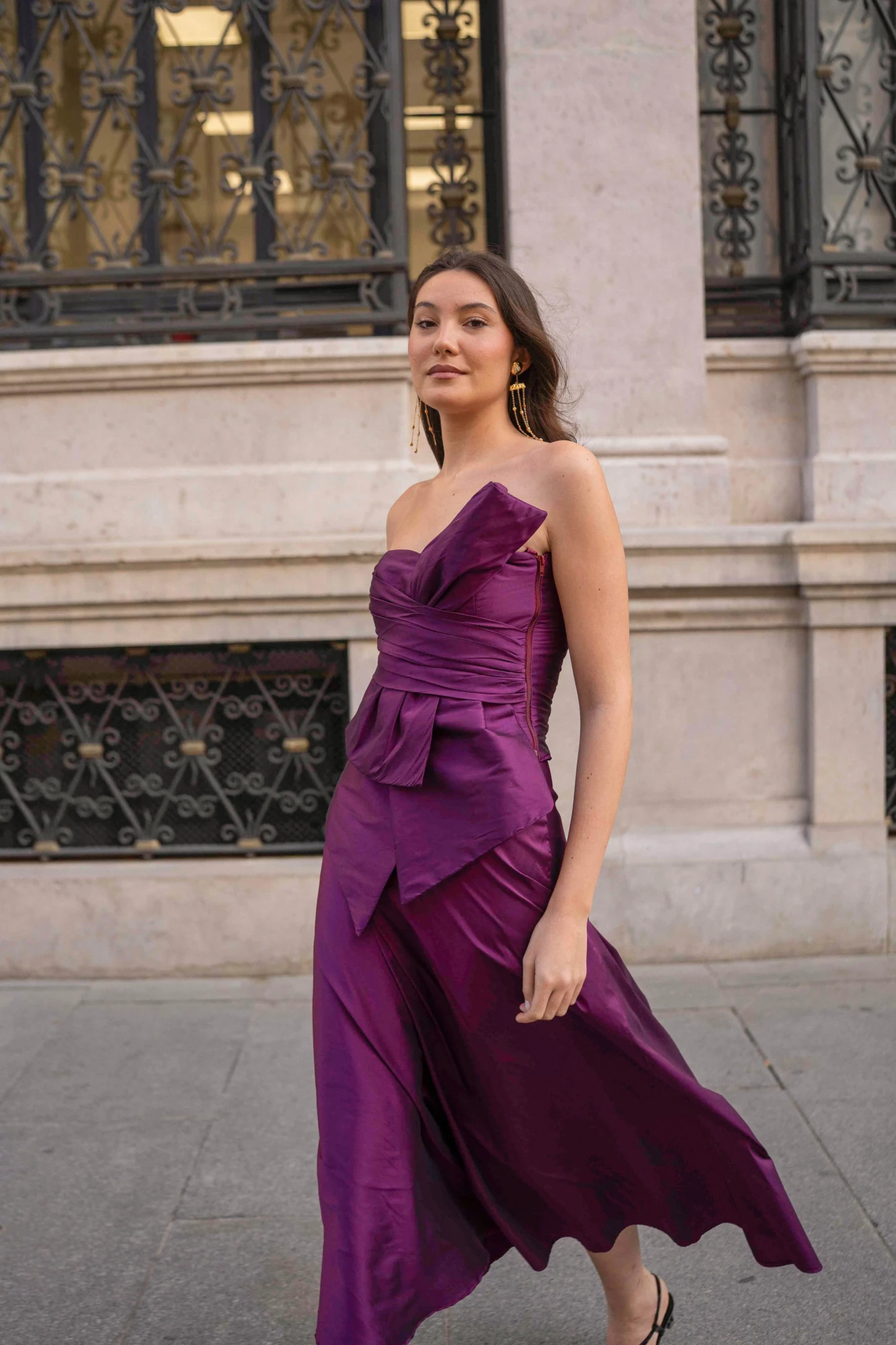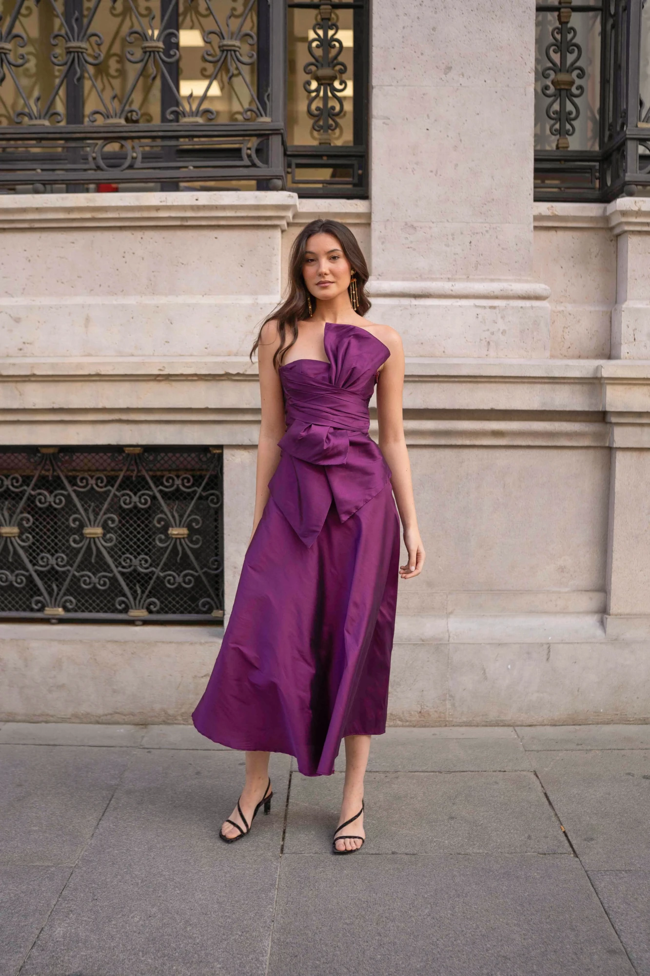 La falda Bruna tiene un corte evasé que aporta movimiento y equilibra la figura, con una línea limpia y muy favorecedora. Es una pieza versátil que funciona tanto con el top Bruna como con otros tops de la colección para bodas de día, eventos de tarde o cenas especiales. Se confecciona en tafetán en tonos como berenjena, cobre, negro, rojo o azul. Si buscas otro color o tejido, puedes consultarnos.
