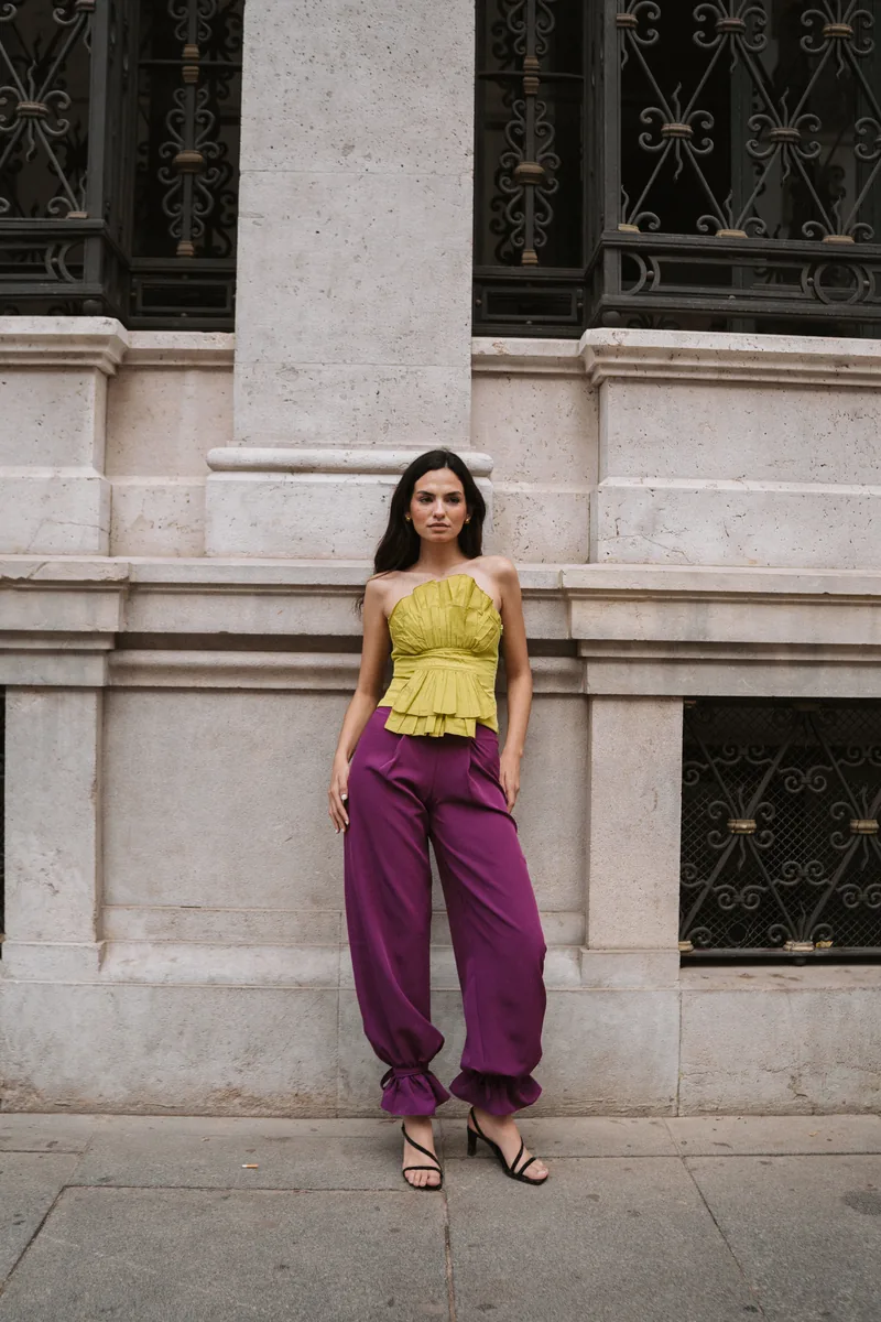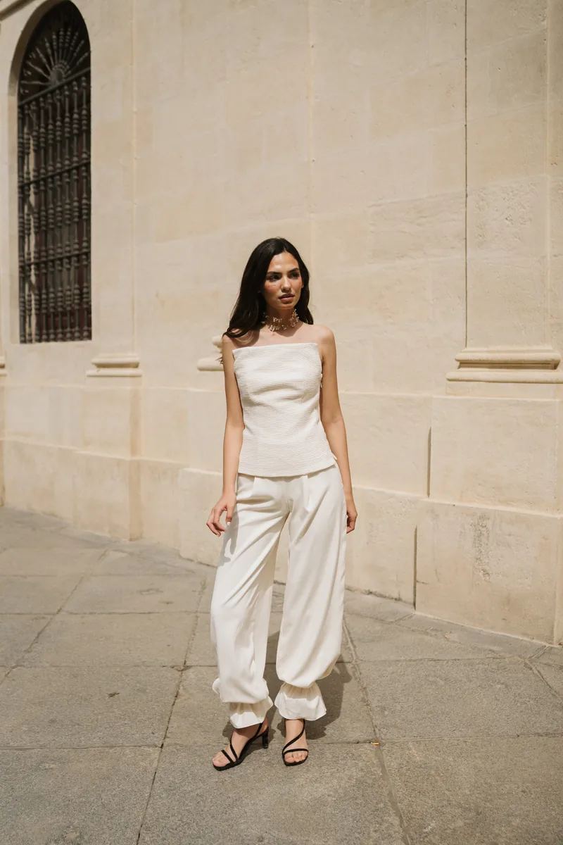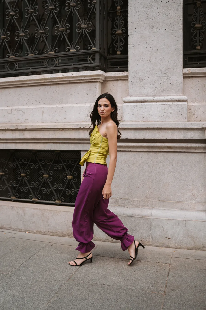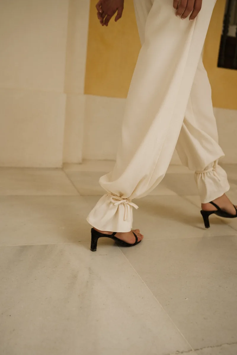 Pantalón bombacho con pinzas y atado al tobillo. Silueta fluida con carácter propio.