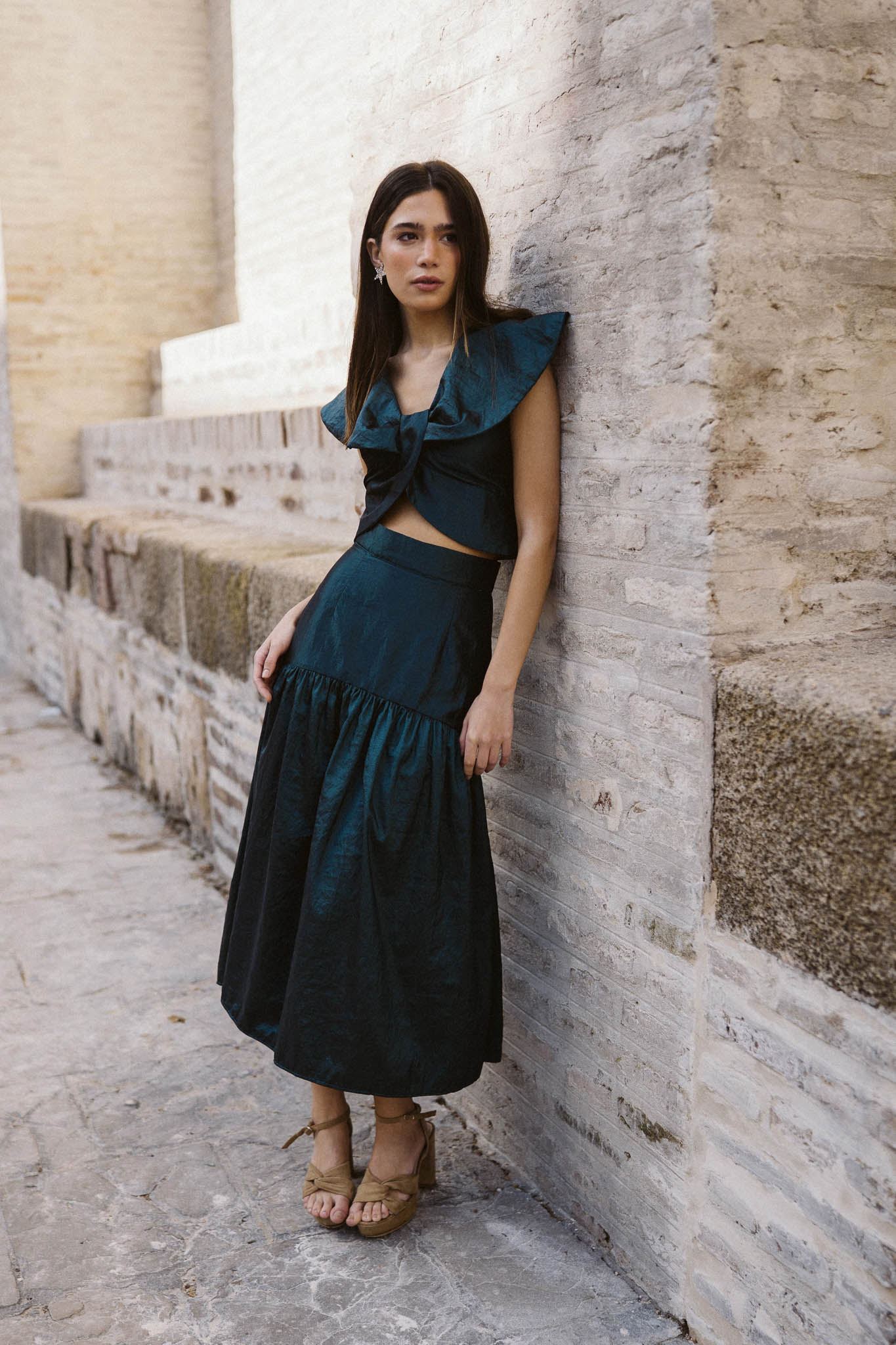Top confeccionado en suave tejido de tafetán, volante en hombro. Cremallera trasera. La confección de las fotos es azul petróleo.