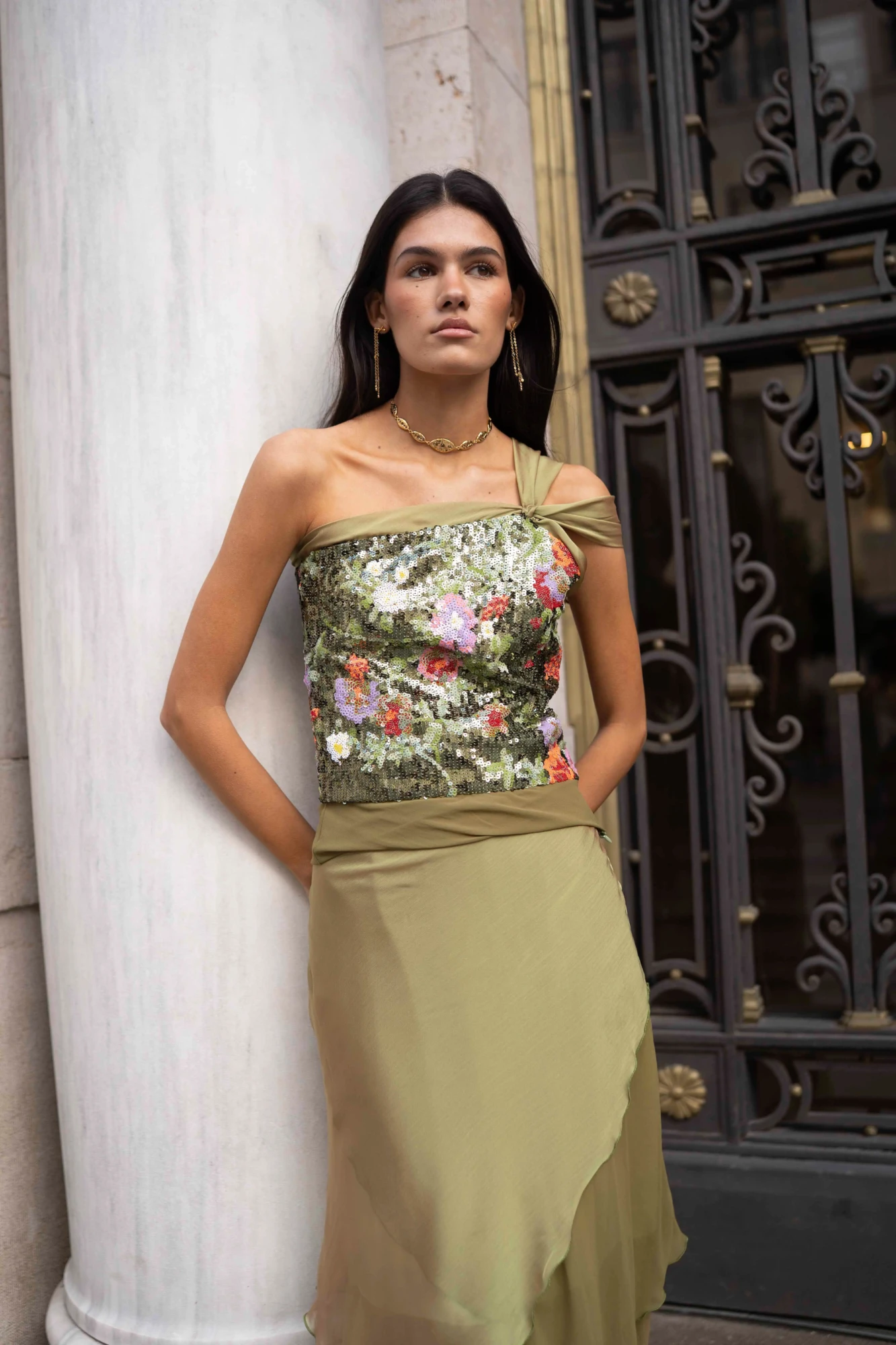 El top Arlet es un top asimétrico de un solo hombro, confeccionado en lentejuelas con bordado floral sobre base verde oliva. El diseño combina brillo y fluidez, y el dibujo de flores aporta textura y luminosidad sin resultar excesivo. Es una pieza protagonista que eleva cualquier pantalón o falda lisa y funciona muy bien en eventos de tarde y noche donde quieres un look especial y sofisticado.