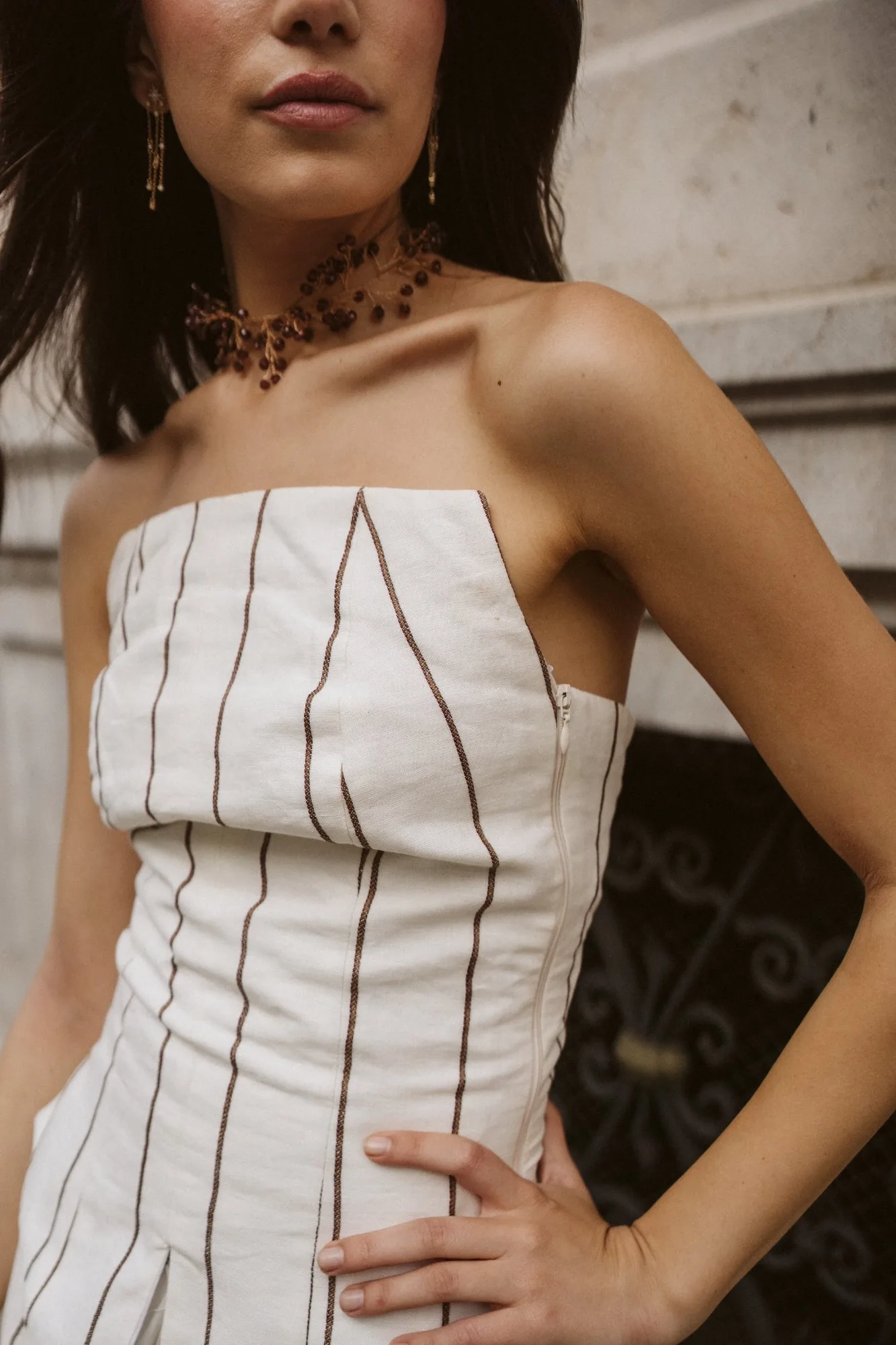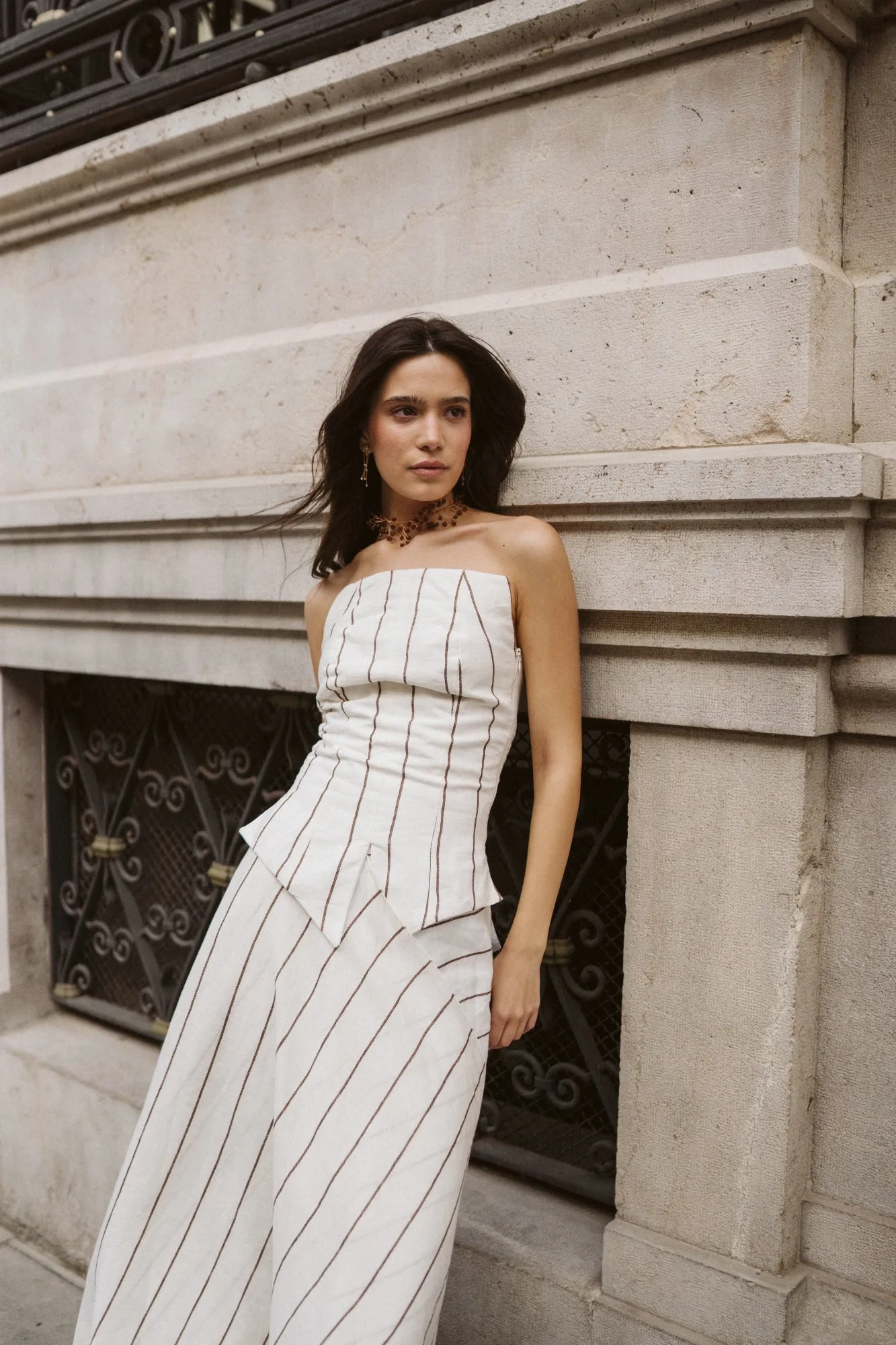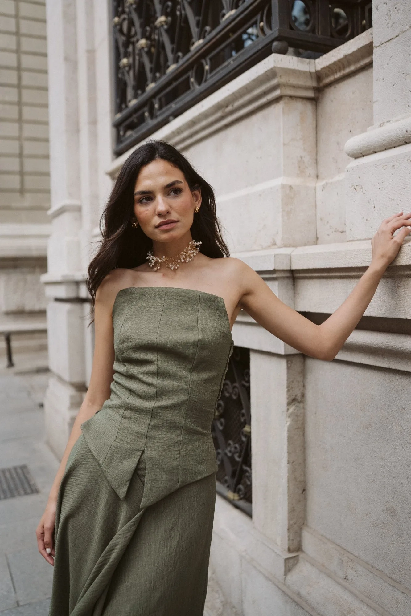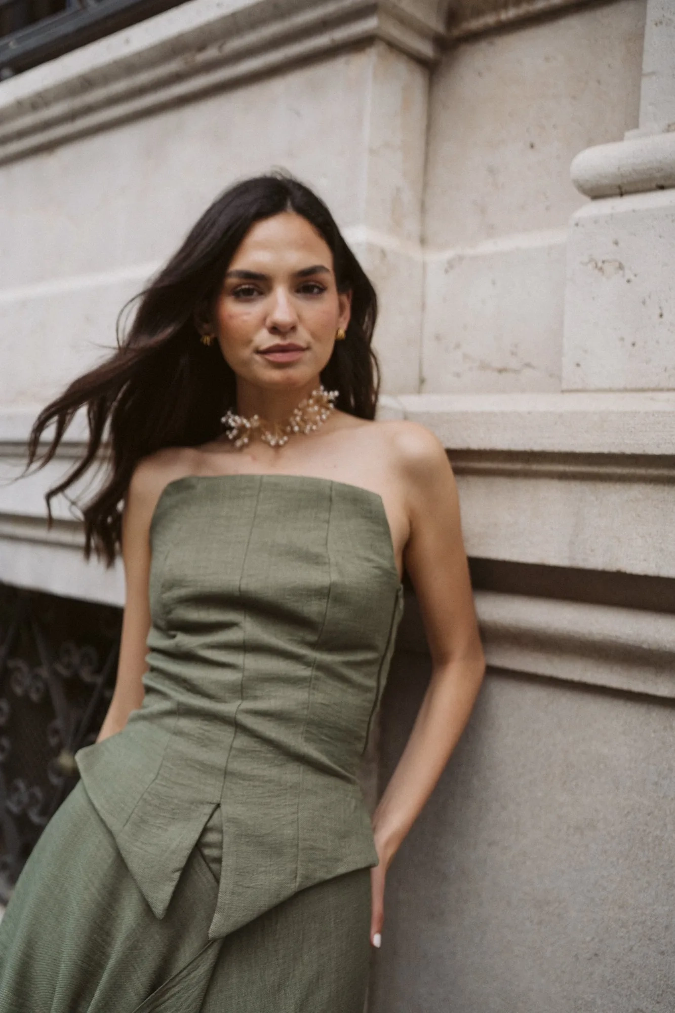 Top tipo corsé sin tirantes, escote recto y estructura rígida que realza y define la silueta. El diseño incorpora cortes y paneles que ajustan la cintura, terminando en un bajo con picos asimétricos que aportan un toque moderno y sofisticado. Ideal para looks elegantes o combinaciones más vanguardistas. Cada prenda se confecciona bajo pedido en nuestro taller de Sevilla, pieza a pieza. Puedes elegir una talla estándar según nuestra guía de tallas o seleccionar la opción "A MEDIDA" e indicar en las notas del pedido tu contorno de pecho, cintura, cadera y tu altura con el tacón del evento. El taller adapta el patrón a tus medidas para que el top siente como un diseño pensado para ti.