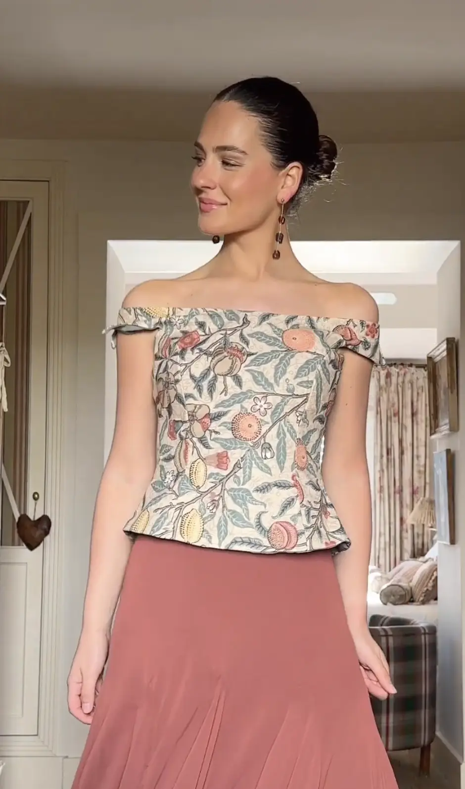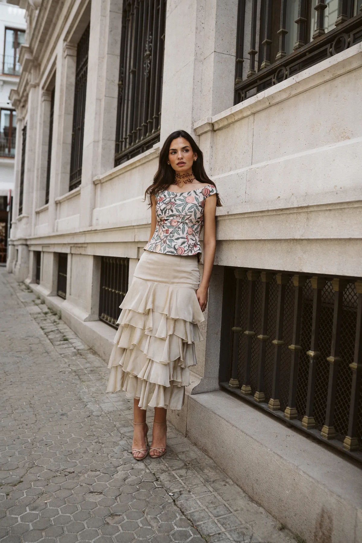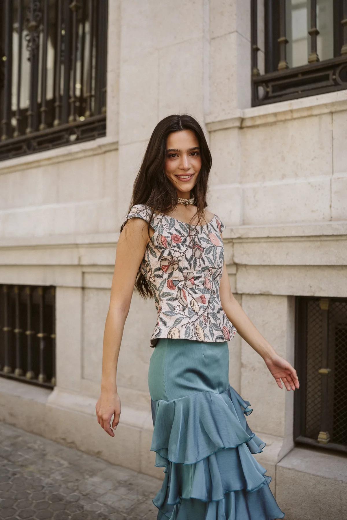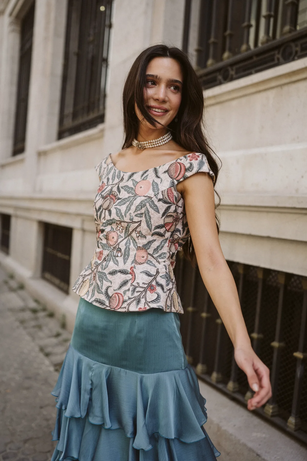 Una silueta limpia que realza la belleza natural de las formas. El Top Elisa Granada está confeccionado a mano en nuestro taller de Sevilla, con un diseño entallado, escote cuadrado y un bajo en pico que estiliza la figura con sutileza. Su exclusivo estampado botánico de granadas, flores y hojas lo convierte en una pieza única y romántica, perfecta para acompañar a faldas vaporosas como la Falda Emily o la falda Lola. Disponible en varias tallas y bajo pedido. Escríbenos por WhatsApp si tienes alguna duda sobre tallas o confección.