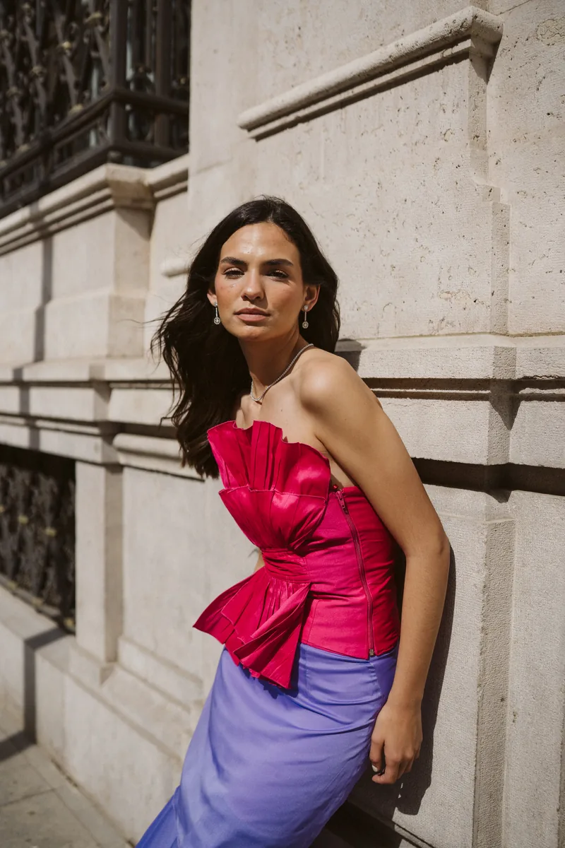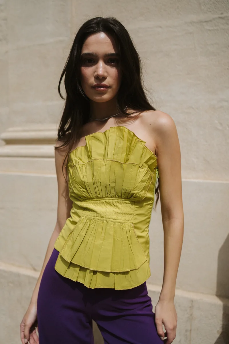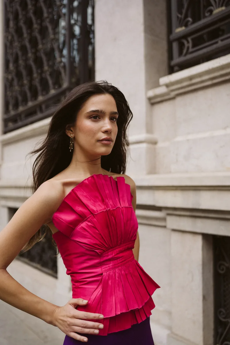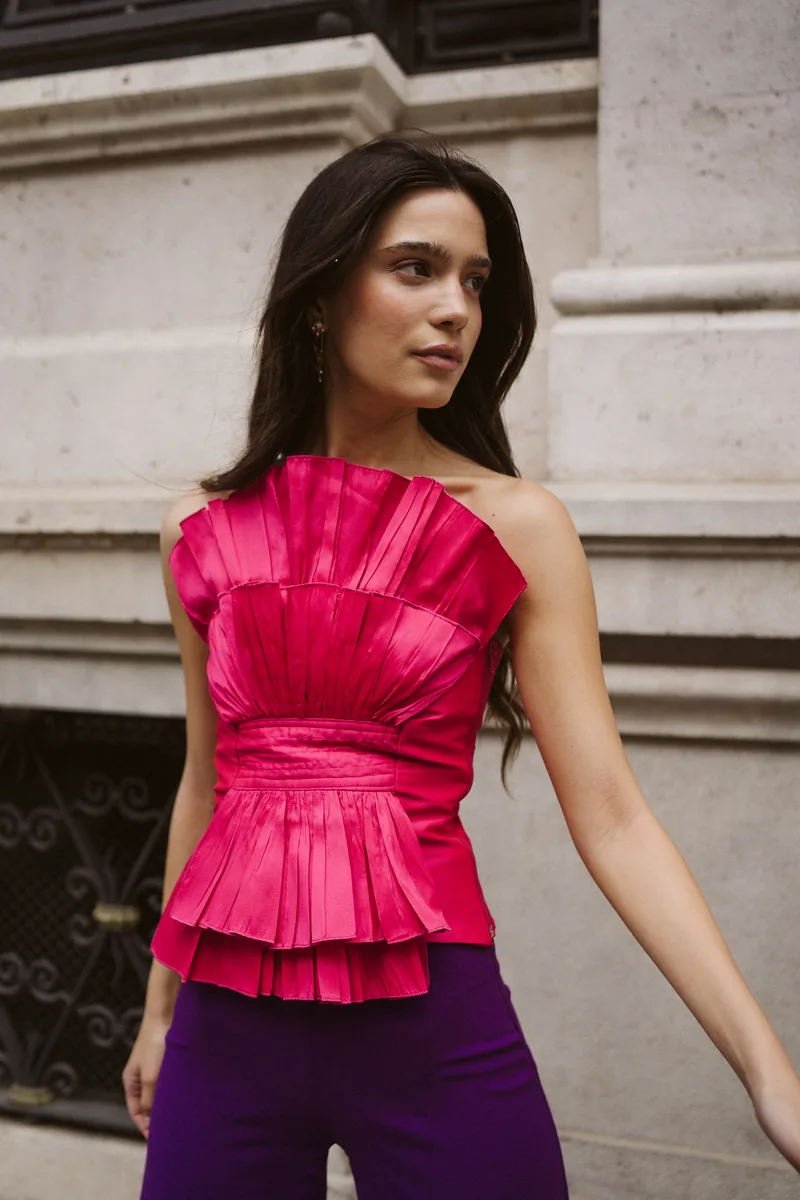 Top palabra de honor en tafetán estructurado con brillo sutil. Pliegues marcados, efecto peplum en cintura y espalda con punto smock para un ajuste perfecto.