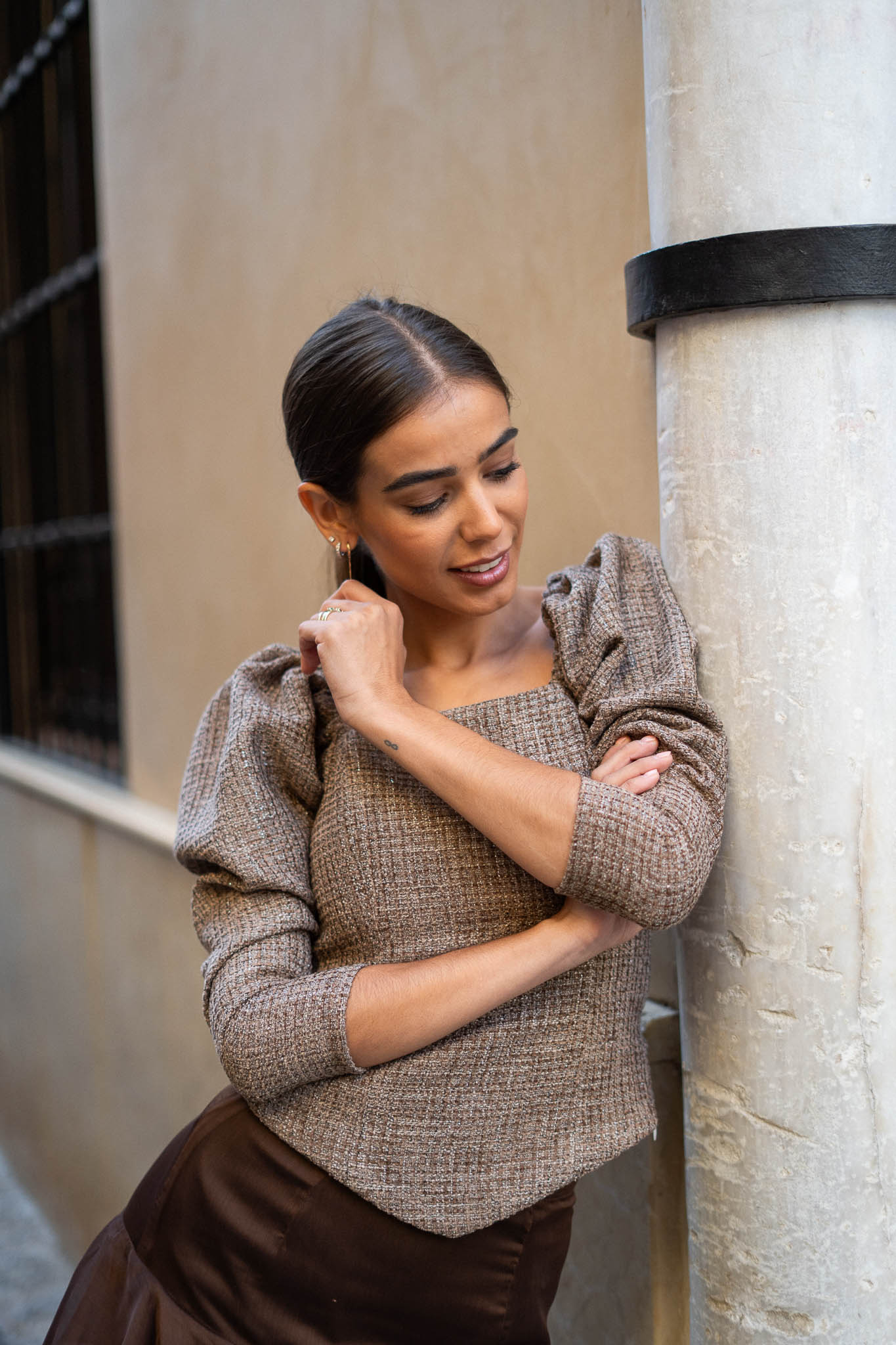 Top de escote cuadrado y mangas abullonadas, bajo en pico. Muy femenino y cómodo gracias al punto smock de la espalda. Cremallera invisible lateral.