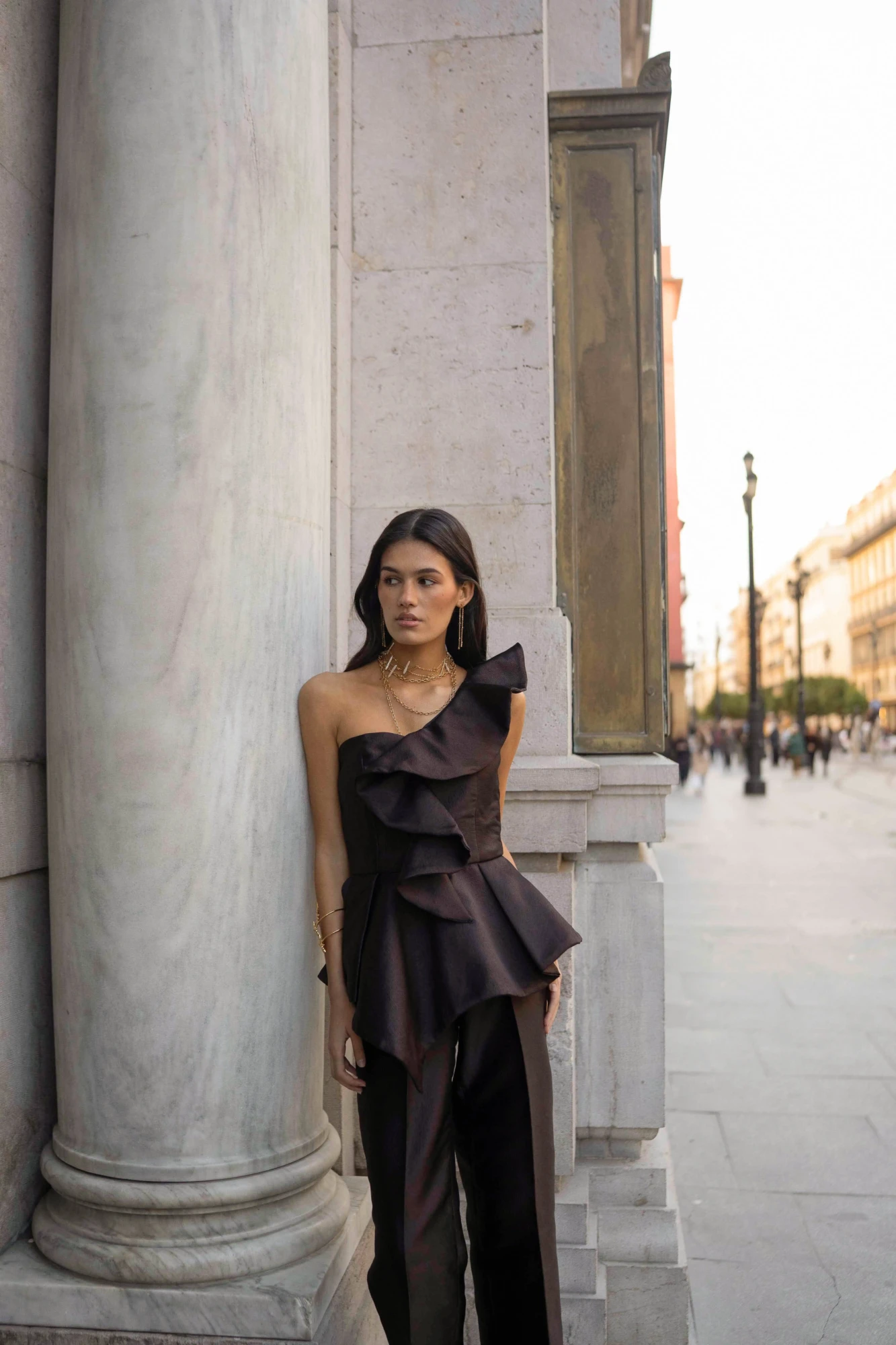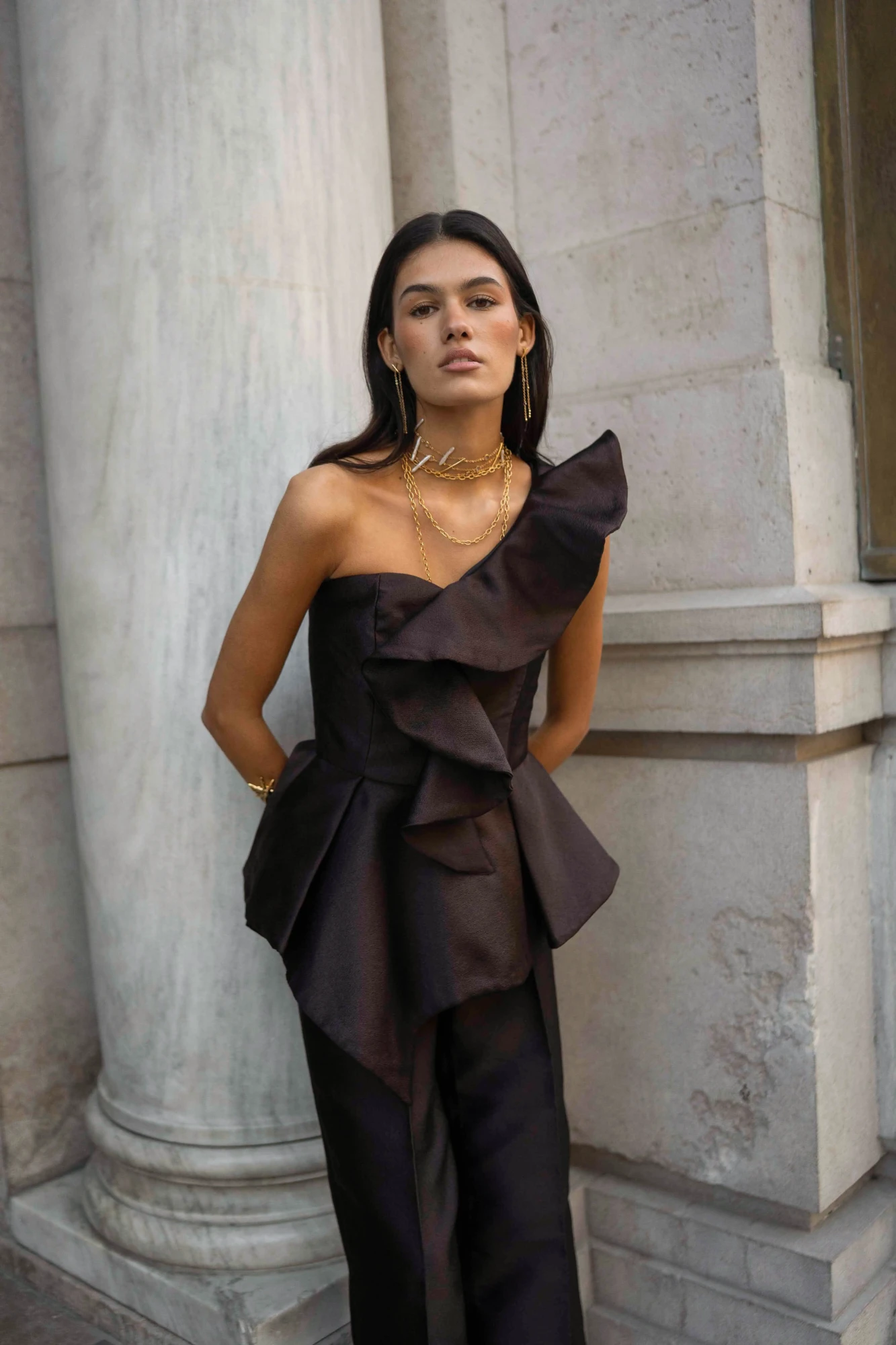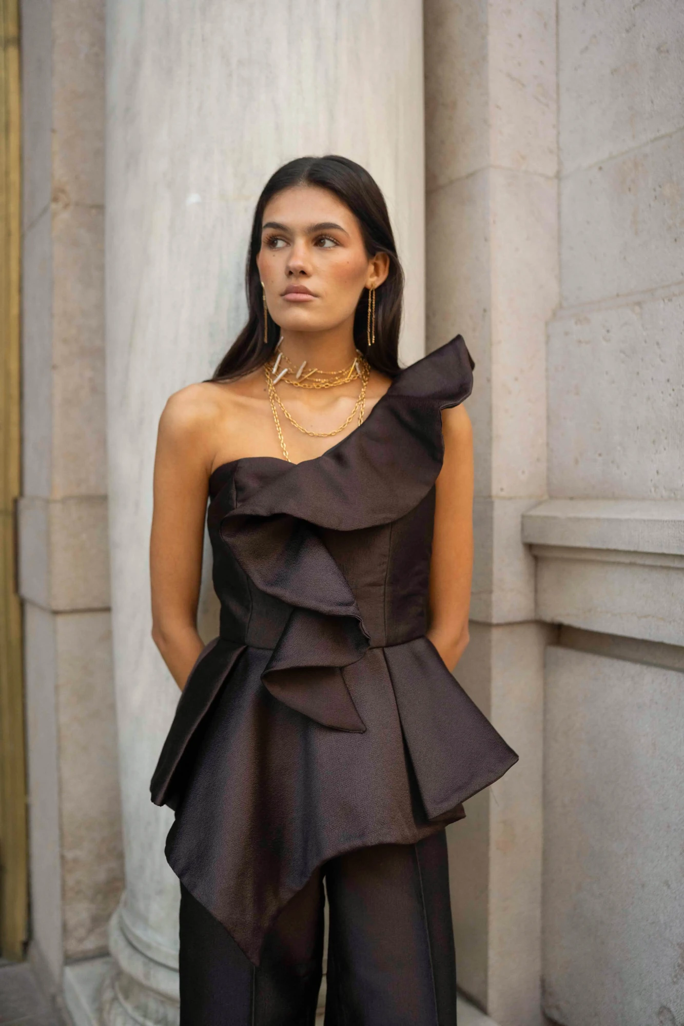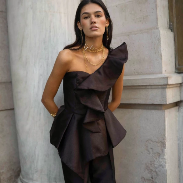 El top Naima es un top asimétrico confeccionado en tejido estructurado de acabado sofisticado. Su volante escultórico en un lateral aporta volumen y movimiento, y dibuja una silueta femenina y contemporánea. El escote de un solo hombro realza cuello y hombros, mientras el cuerpo entallado define la figura con elegancia. Es una pieza pensada para eventos especiales y looks de noche en los que buscas un top diferente y muy favorecedor.
