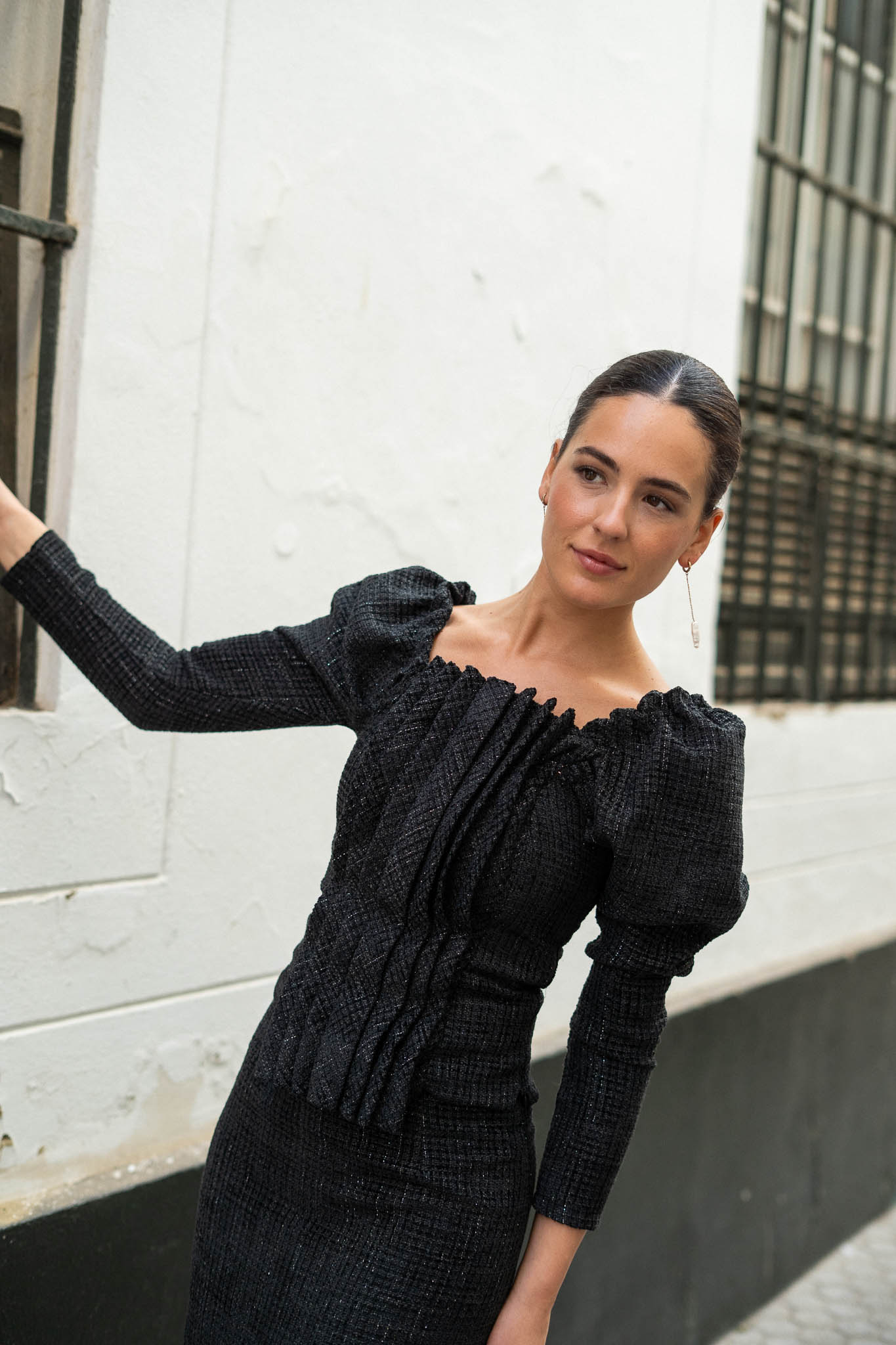 Top tipo corsé ceñido a cintura con tablitas, mangas abullonadas. Cremallera trasera.