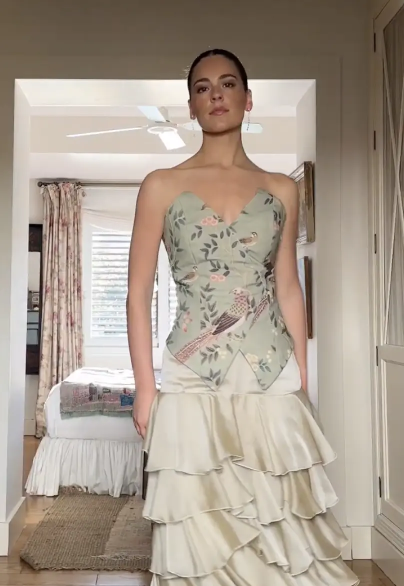 Su diseño único, que combina un suave tono verde menta con un delicado estampado de aves y motivos botánicos, lo convierte en una prenda protagonista para cualquier ocasión especial.