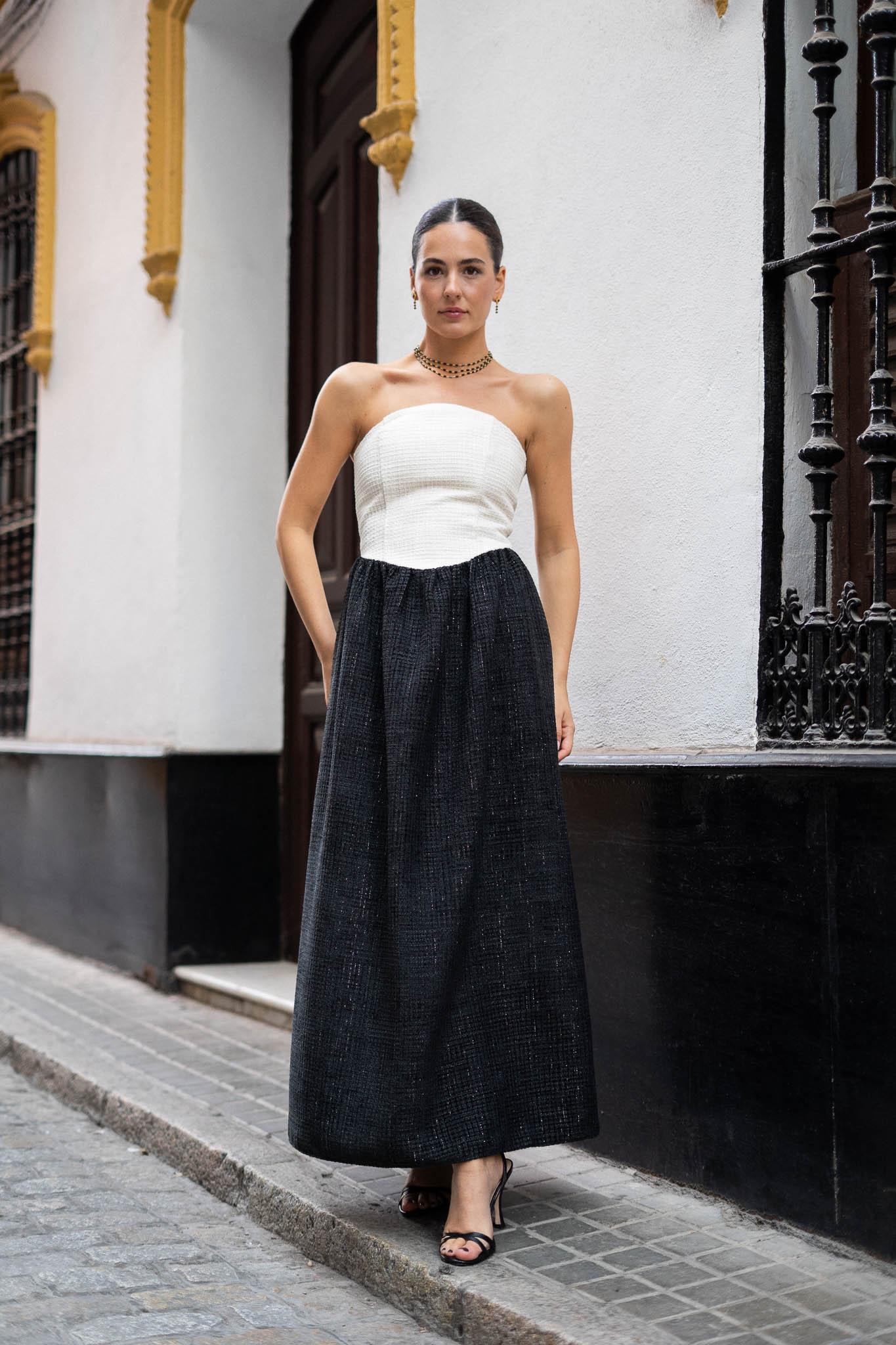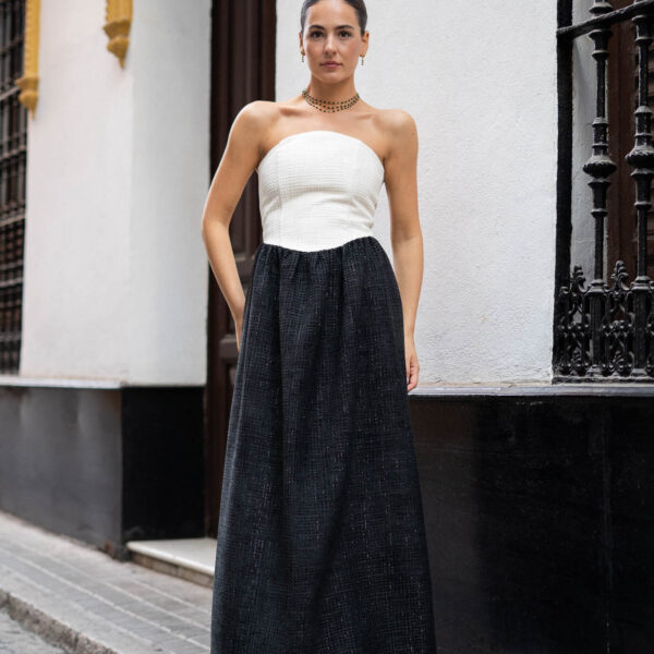 Vestido con cuerpo encorsetado ceñido en cintura. Tejido tipo Chanel muy suave. Cremallera invisible.