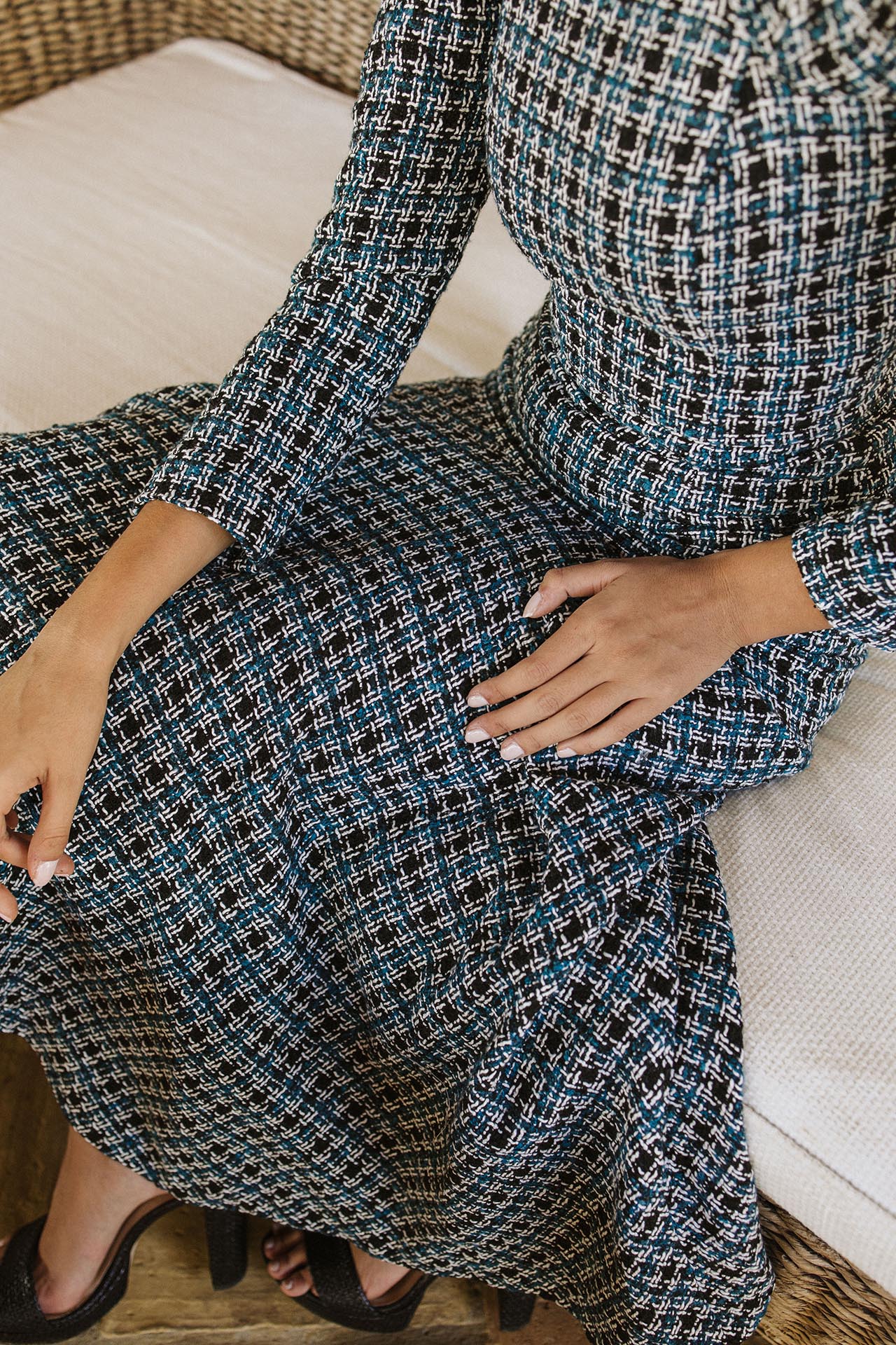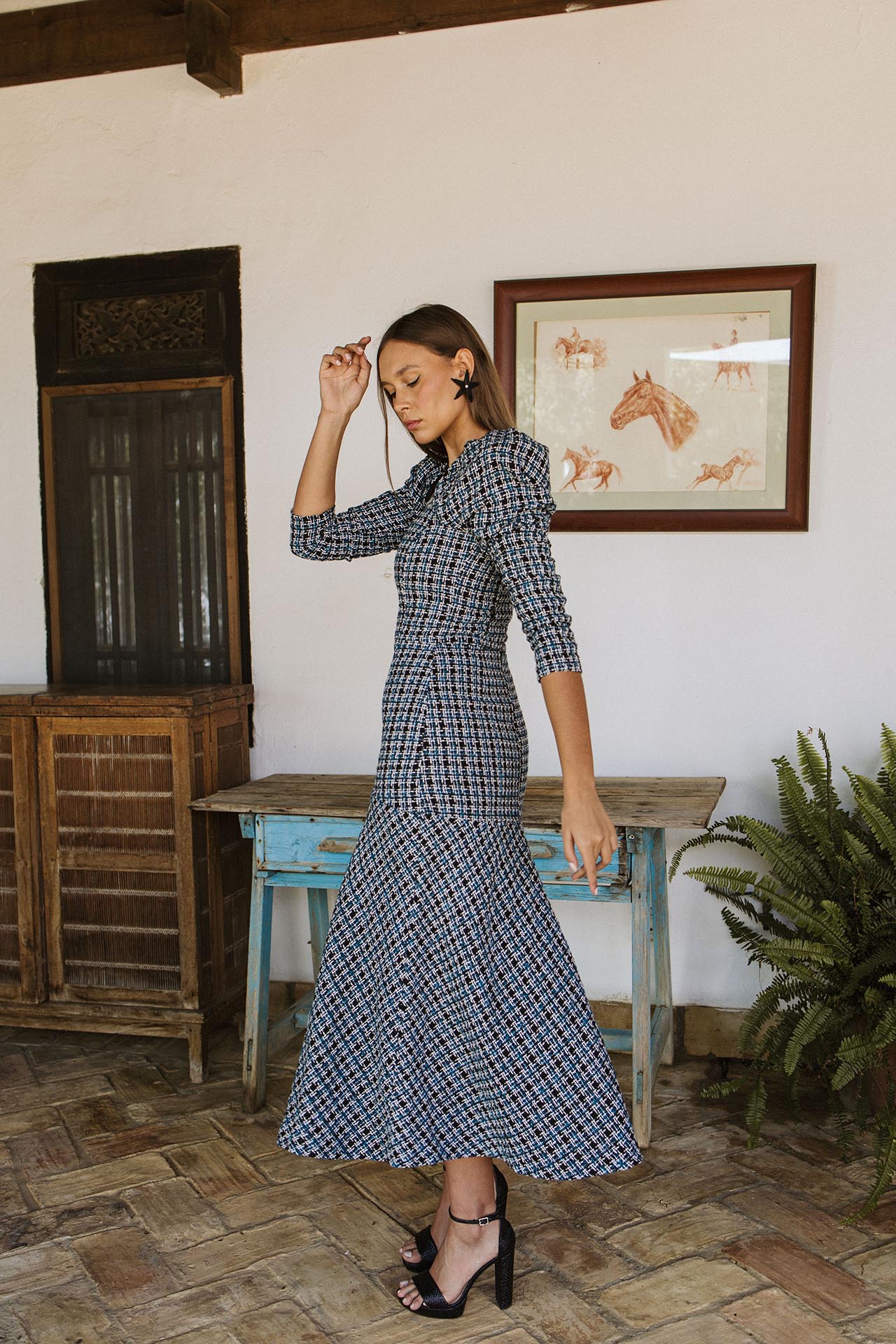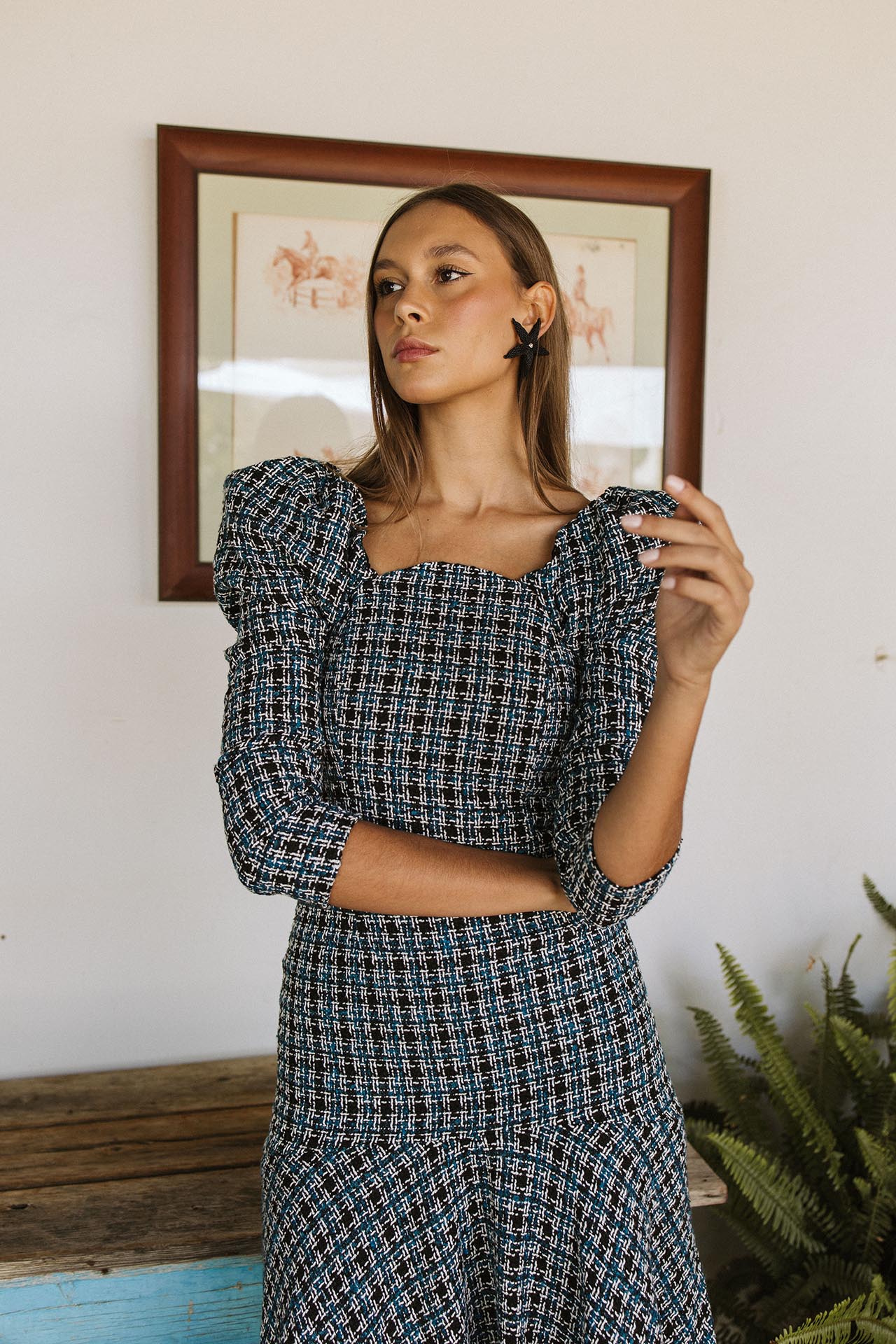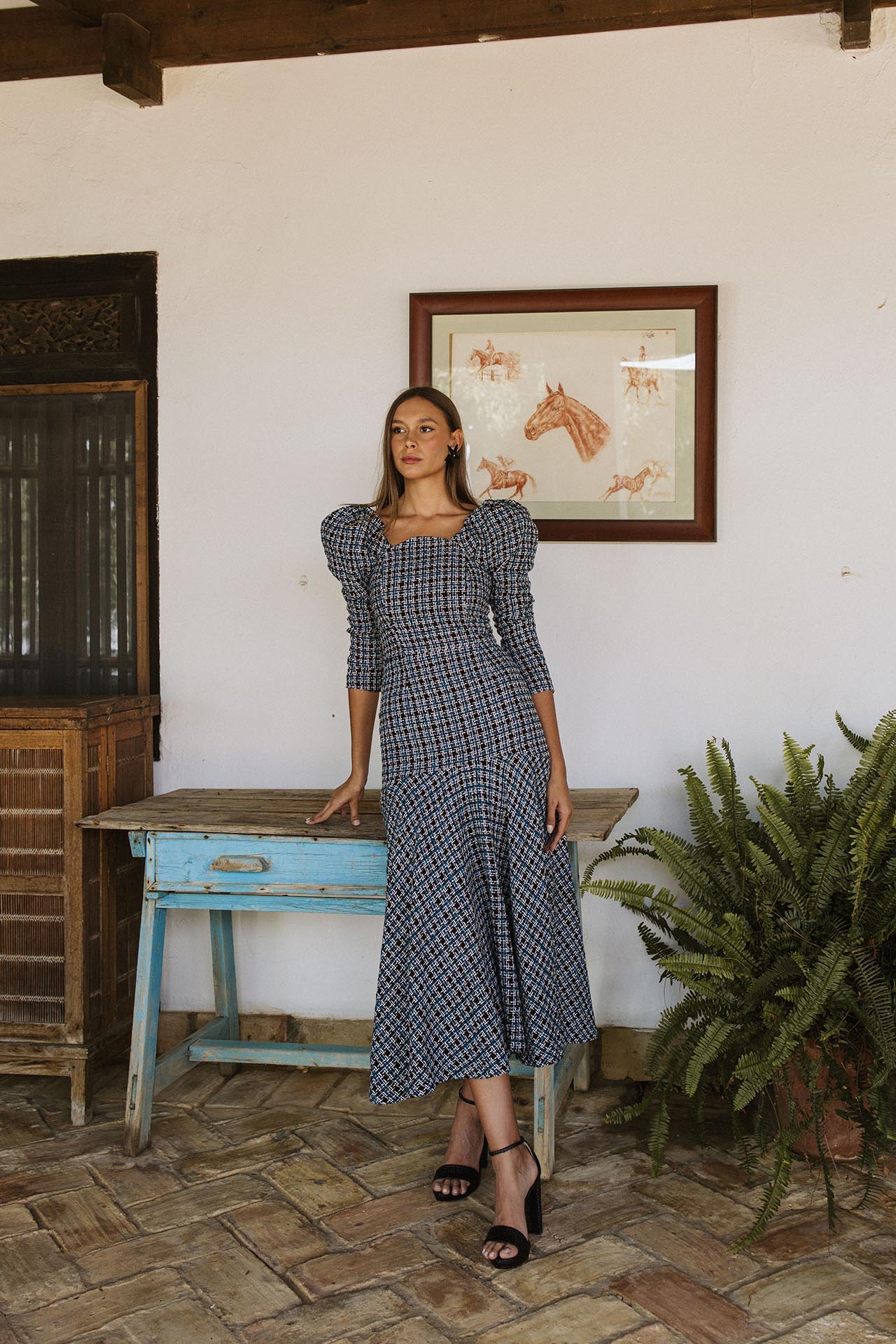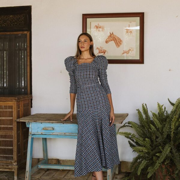 Vestido con escote muy favorecedor y mangas abullonadas. Corte a la cintura y falda evasé.